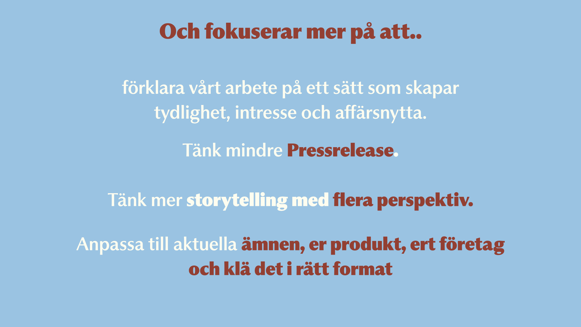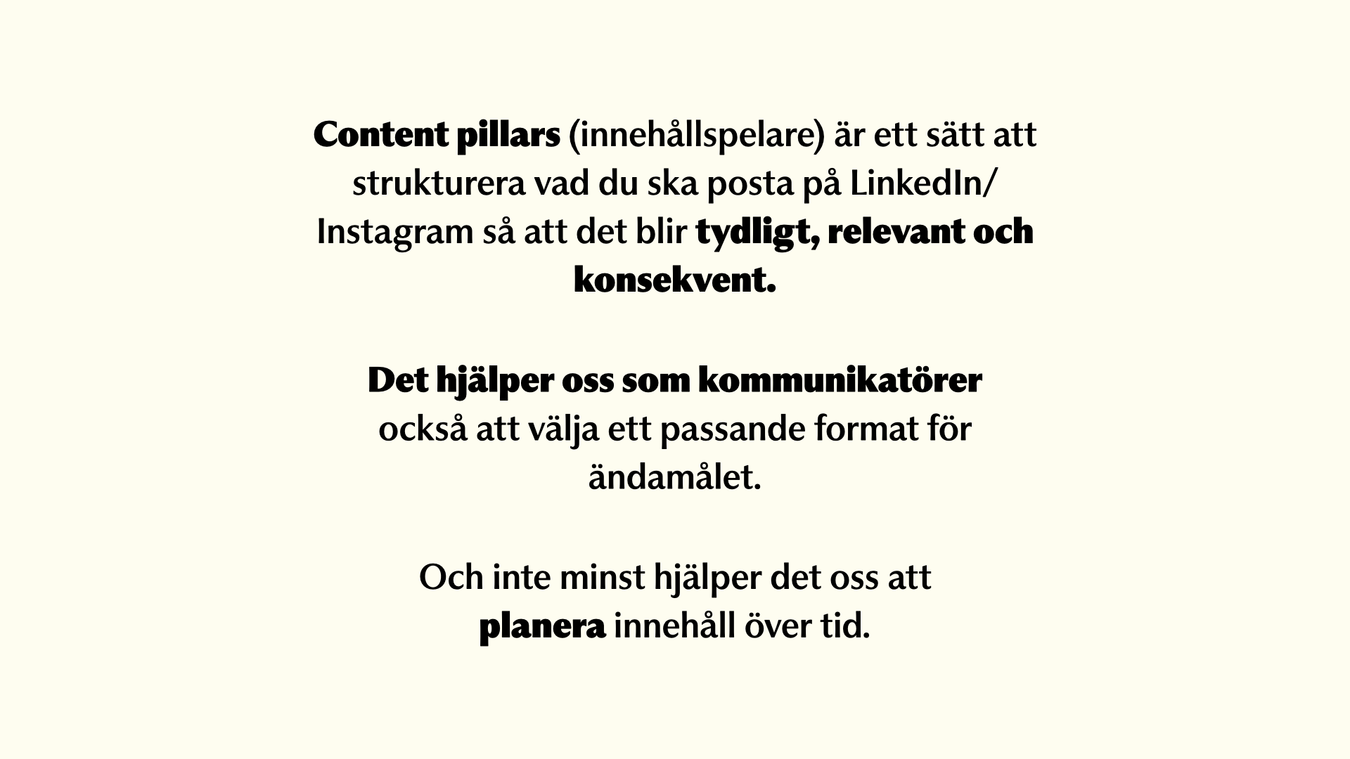 1. Content pillar strategy — En innehållspelare är ditt kärnämne. Därifrån bygger du ut varierade berättelser — bakom kulisserna, kundperspektiv, teammöten — som alla förstärker samma centrala budskap. Det gör innehållsplanering enklare för kommunikationsteam.